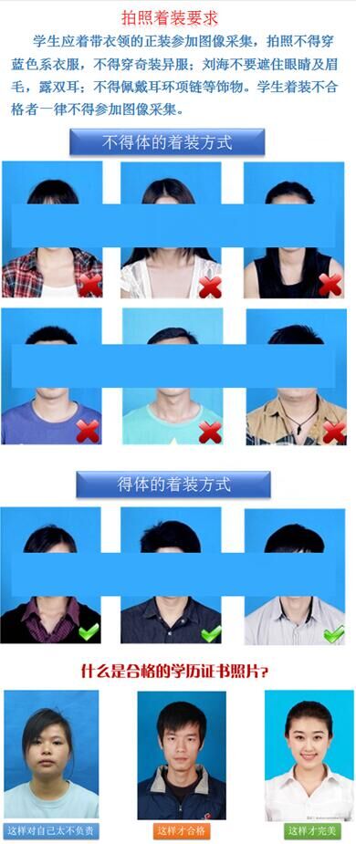 学生在拍摄前严格按照着装要求自行整理好仪表,否则不予拍摄:1.图像采集时背景统一为蓝色,学生着装请避免类似颜色;2.学生应着带衣领的正装参加拍摄,并在拍摄前把衣领整理好,不得穿奇装异服;3.不要化浓妆,长头发的同学须把头发扎起,并放到肩膀后面,避免披肩散发,刘海不得遮住眉毛和眼睛,必须露出耳朵;4.不要佩戴耳环项链等饰物。具体标准参见《毕业生拍照着装要求》(附件3)。