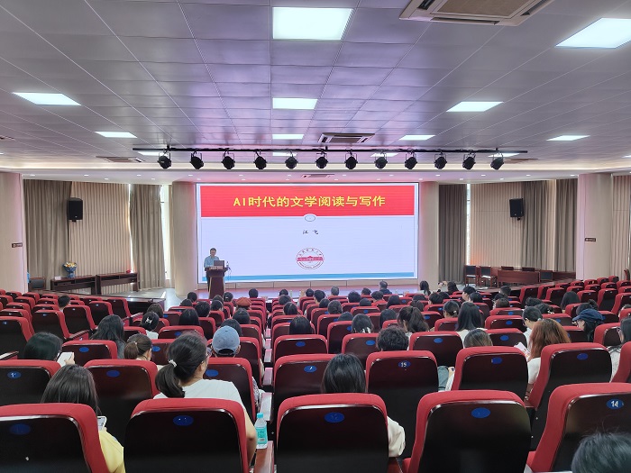 4月25日下午,安徽省作家协会副主席、安徽文艺评论家协会副主席、安庆师范大学人文学院教授江飞应邀在Beat365文端楼二楼报告厅作《AI时代的文学阅读与写作》学术报告。黄山市青年作家胡玉琪、汪远定、郭飞及文学院、外国语学院相关师生参加,报告由文学院副院长朱宏胜主持。