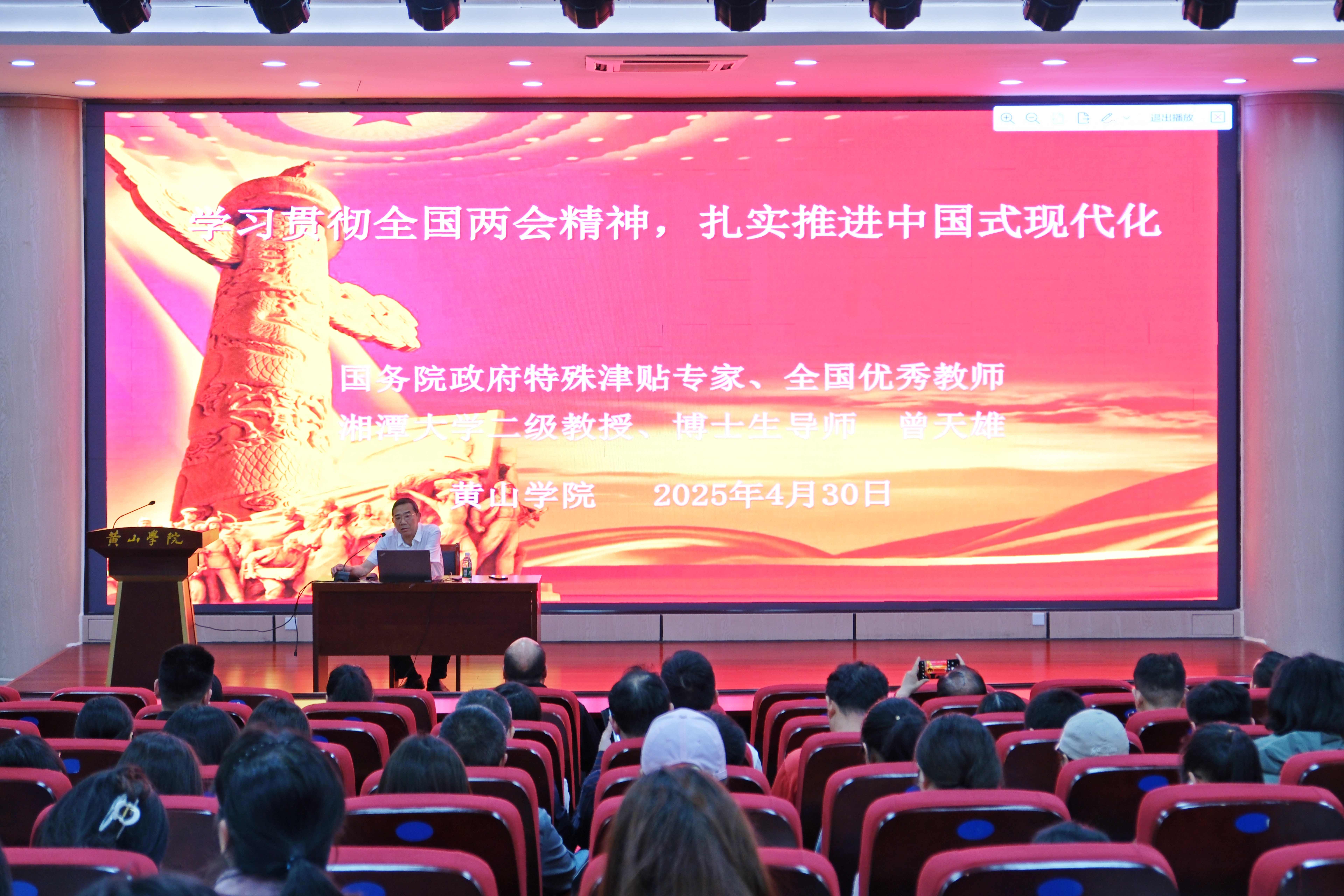 报告会中,曾天雄教授介绍了今年全国两会召开的基本情况、政府工作报告等主要内容,介绍了习近平总书记在有关团组会议上的重要讲话精神,并阐释了习近平总书记关于科技创新和产业创新是发展新质生产力的基本路径的重要论述和中国式现代化的理论创新与实践突破。报告强调,2025年全国两会是在“十四五”规划收官之年,“十五五”规划谋篇之年召开的重要会议,是一次凝心聚力、真抓实干、团结奋进的大会,我们要为以中国式现代化全面推进强国建设、民族复兴伟业不懈奋斗。