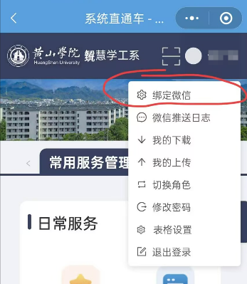 第二步,微信搜索智慧校园,登录进入智慧学工,右上角点击名字绑定微信号。如下图: