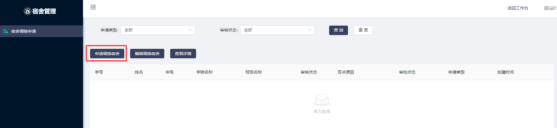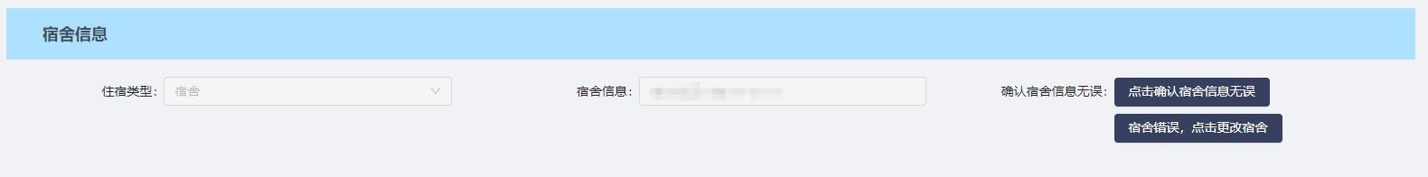 5.宿舍信息:若宿舍信息无误,点击【点击确认宿舍信息无误】按钮;若宿舍有误,点击【宿舍错误,点击更改宿舍】按钮,发起申请调换宿舍申请。如下图: