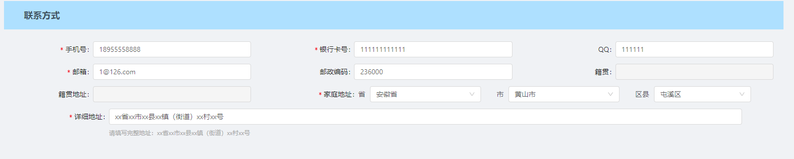 3.联系方式:手机号、银行卡、QQ、邮箱、邮政编码(家乡邮编)家庭地址、详细地址。如下图: