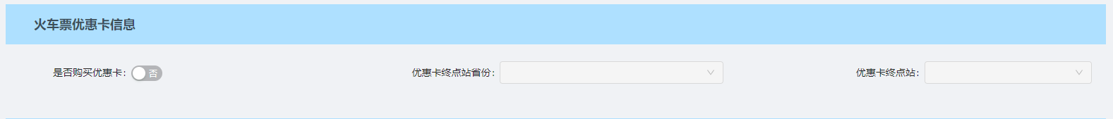 4.火车票优惠卡信息:是否购买优惠卡、优惠卡终点站省份、优惠卡终点站,要与学生证保持一致。如下图: