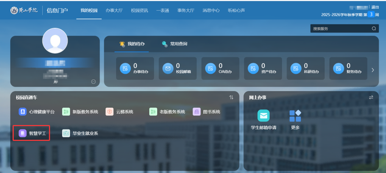 学生通过微信的【智慧校园】小程序或【信息门户】进入【智慧学工】如下图:
