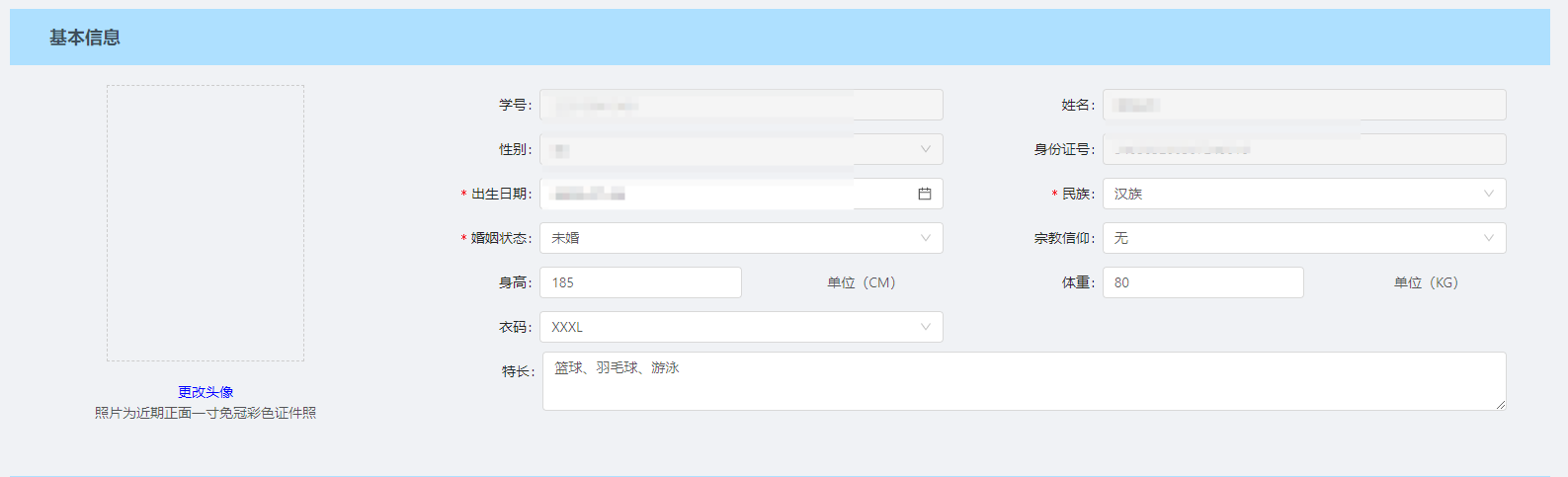 1.基本信息:婚姻状态、宗教信仰、身高、体重、衣码、特长等。如下图: