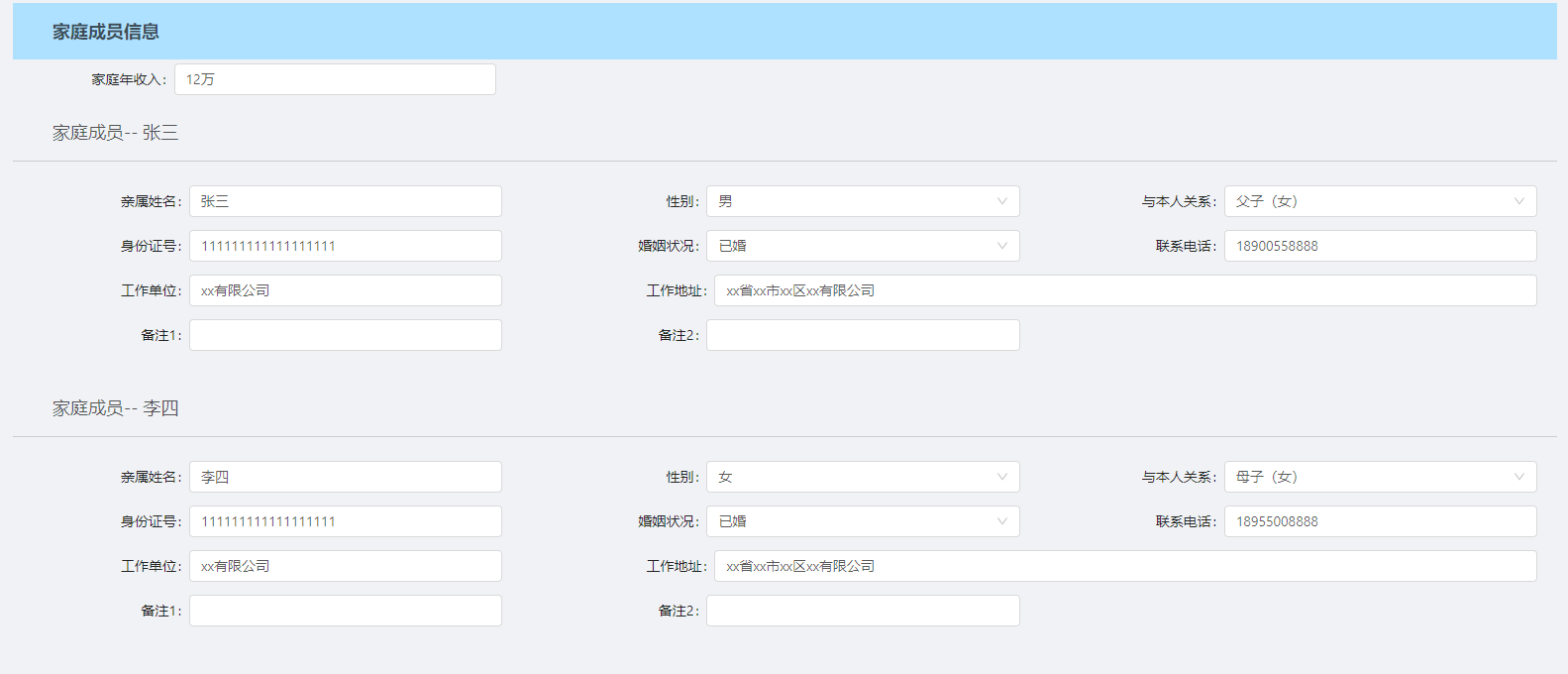 6.家庭成员信息:家庭年收入、亲属姓名、性别、与本人关系、身份证号、婚姻状况、联系电话、工作单位、工作地址。如下图: