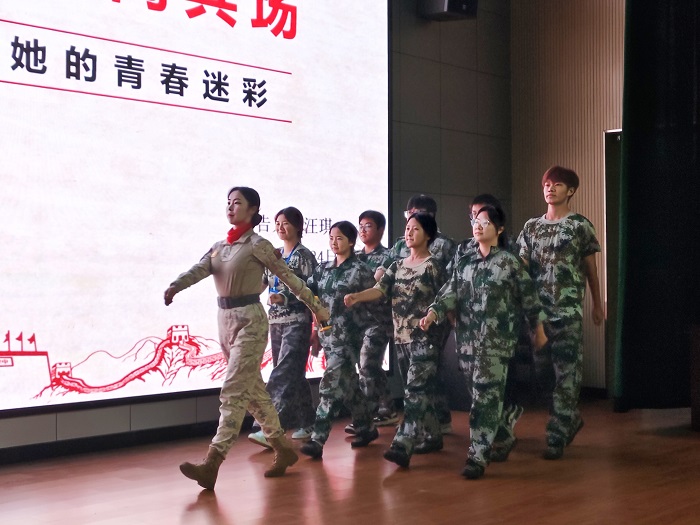 在互动环节,汪琪现场指导2025级军训新生进行队列动作训练,她耐心地示范并讲解动作要领,增强了在场学生的体验感与参与感。在她的悉心指导下,学生们的敬礼动作越来越规范,越来越有气势。这一环节,无疑成为了本次活动中最令人难忘的精彩瞬间。