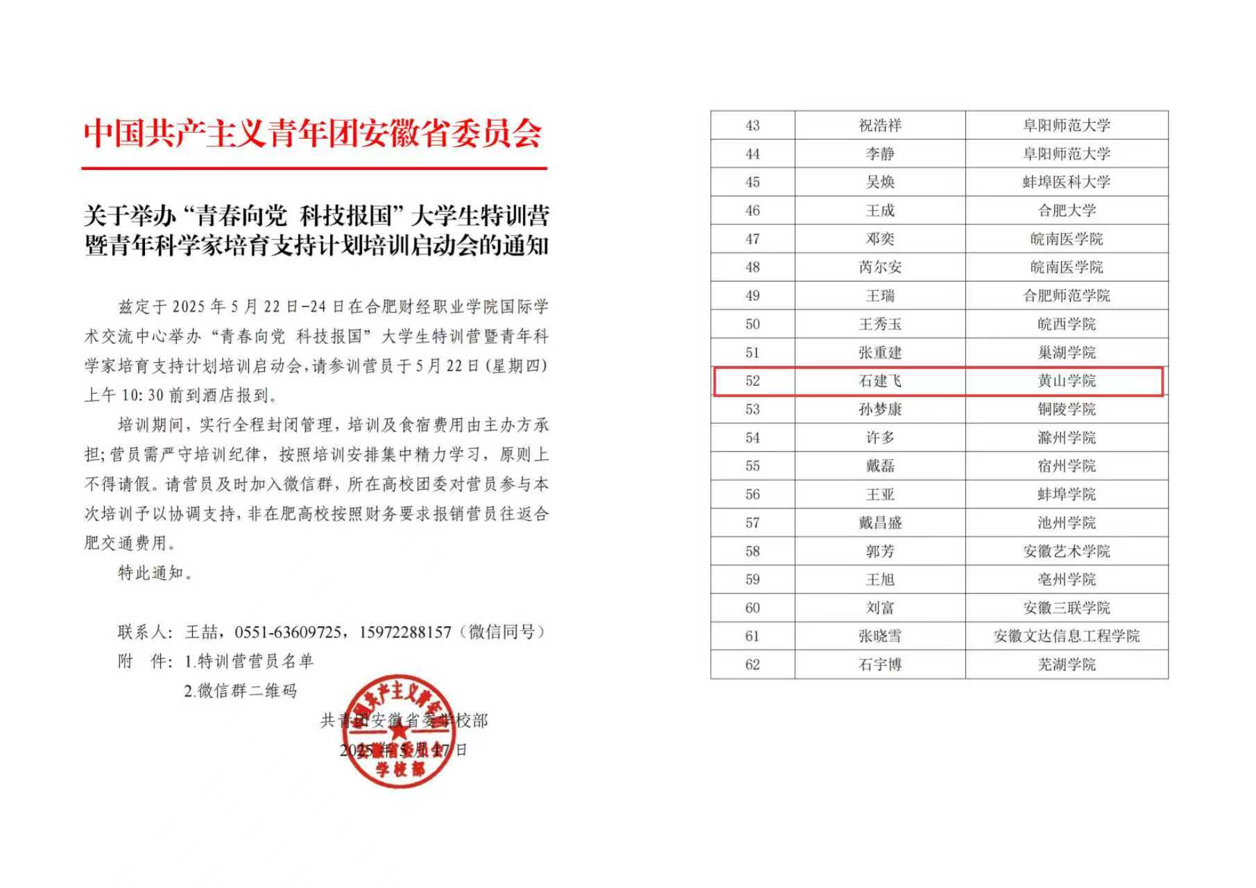 为深入学习贯彻习近平总书记关于科技创新的重要论述,积极组织动员青年人才投身中国式现代化安徽实践,共青团安徽省委依据《青年助力科技创新工作方案》,正式启动首批 “青年科学家培育支持计划”。艺术学院 22 级产品设计班石建飞同学凭借扎实的专业素养与突出的创新潜力,成功入选该计划,成为学院青年学子投身科技创新领域的优秀代表。