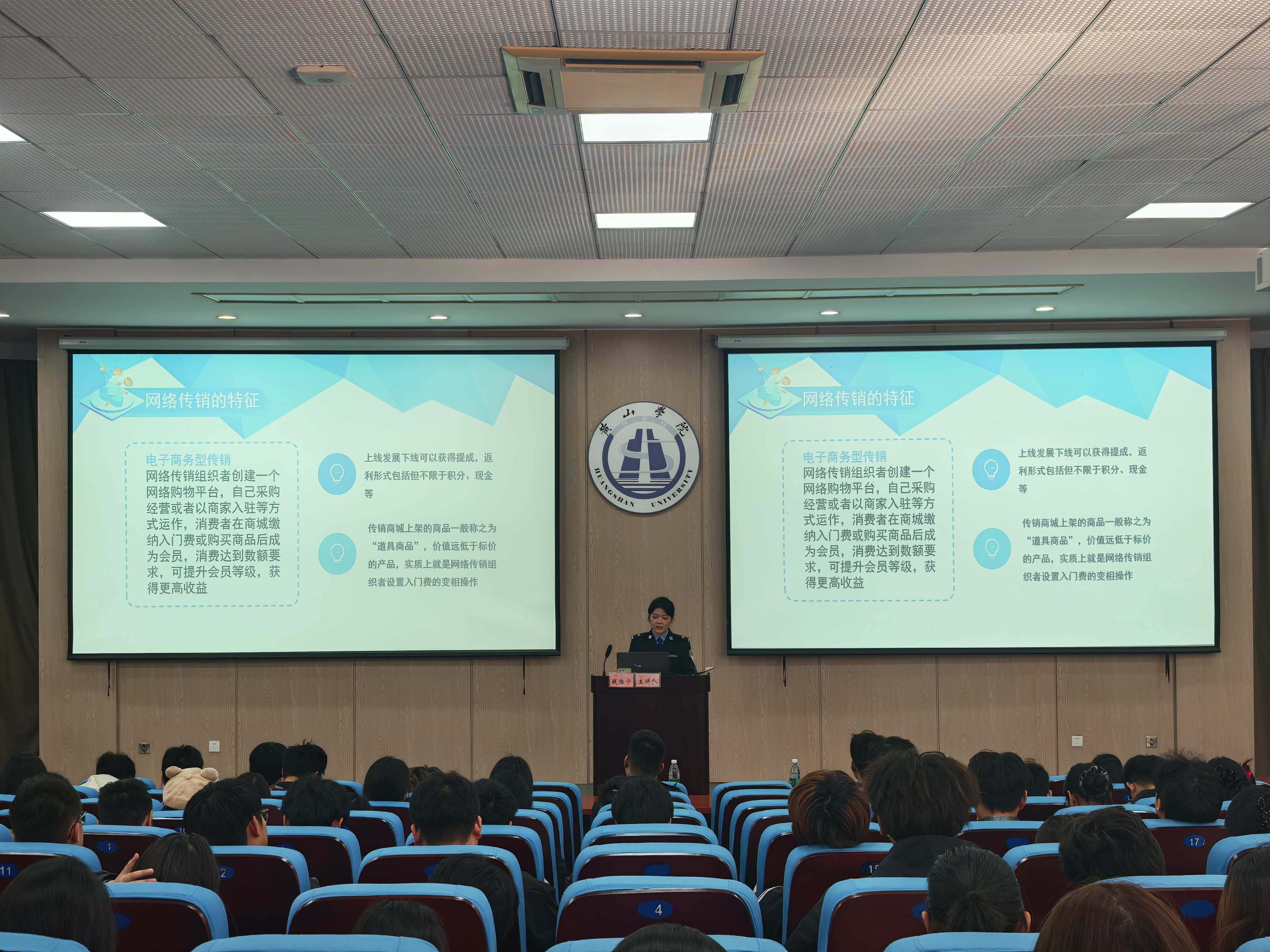 10月22日下午,Beat365于率水校区文端楼一楼报告厅举办了防范传销宣传教育主题讲座。此次讲座特别邀请屯溪公安分局的钱怡宁担任主讲人,各班级的安全委员参加了讲座。