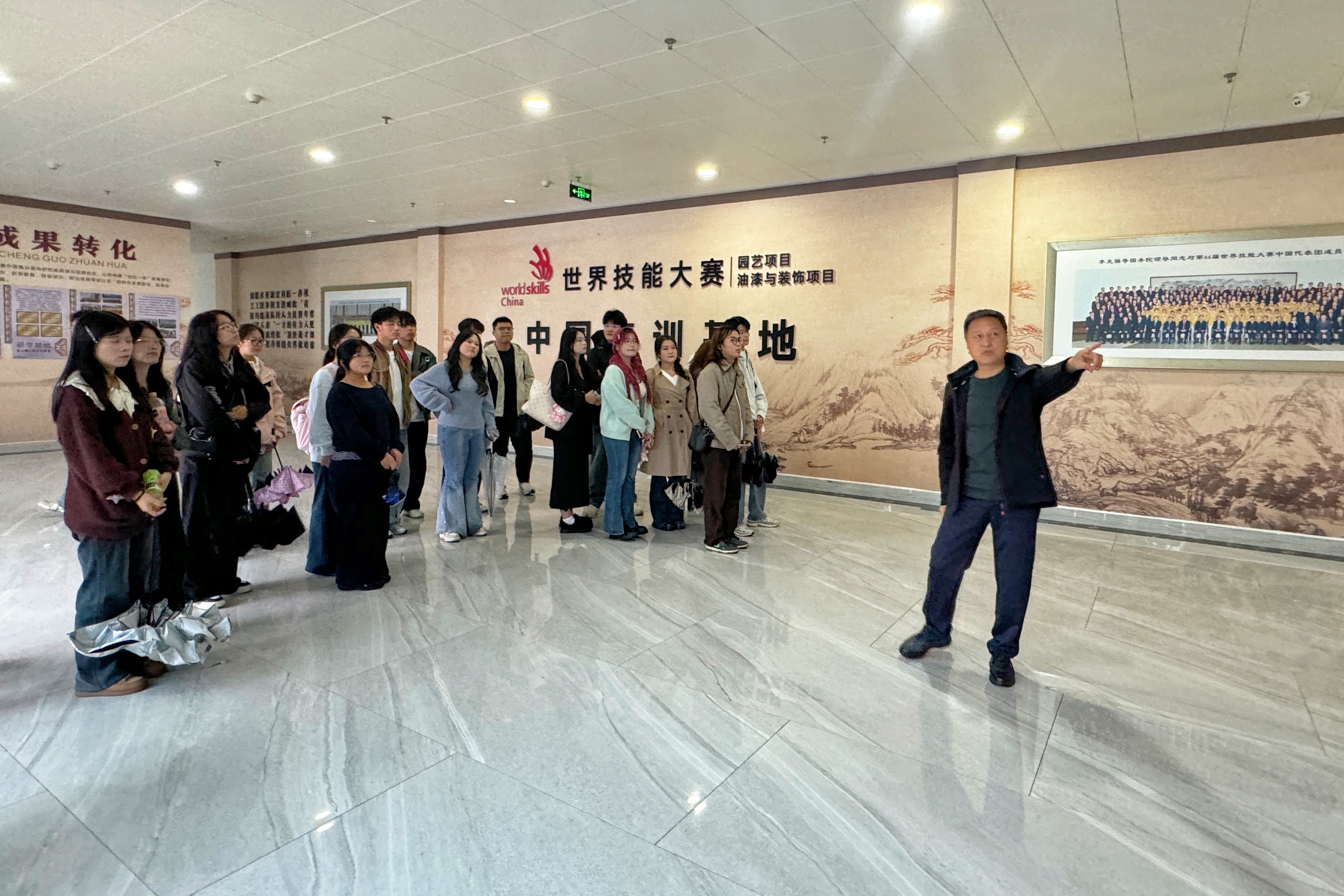 采风首站,学生记者们深入世界技能大赛中国集训基地,重点观摩了油漆与装饰、园艺两大项目。在油漆与装饰项目实训工坊,队员们近距离观察了选手对色彩调配、肌理塑造等工艺的精准把控。“金属效果涂装”“仿木纹喷涂”等高超技艺,不仅展现了工艺美学的极致追求,其背后毫米级的国际赛事标准,更与新闻工作所要求的精准与严谨深度共鸣。