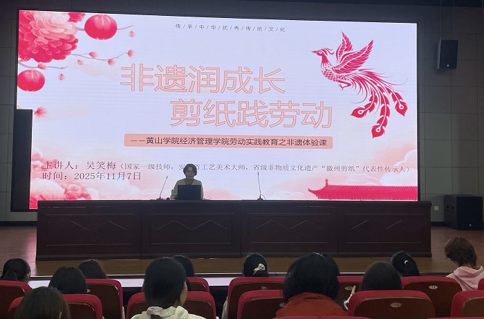 为传承中华优秀传统文化,深化劳动教育内涵,11月7日下午,经济管理学院特邀省级非物质文化遗产“徽州剪纸”代表性传承人吴笑梅老师进校园开展“非遗润成长、剪纸践劳动”劳动实践教育之非遗剪纸体验课。本次活动作为该院劳动教育课程的重要实践环节,让同学们在指尖流转间感受非遗魅力,在动手实践中体悟劳动价值。