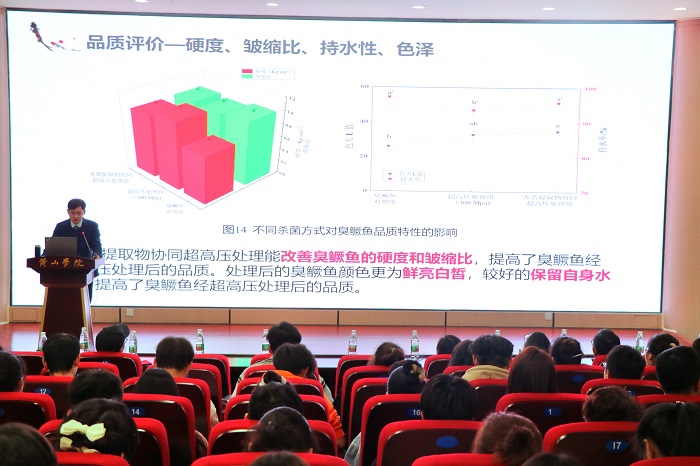 吴永祥结合近年来科研团队的产学研合作成果,以黄山臭鳜鱼为臭味食品代表,从黄山臭鳜鱼产业现状、臭鳜鱼传统加工工艺、产品质量标准体系建立、工业化加工技术参数优化与品质分析、冷杀菌关键技术研发、即食臭鳜鱼生产技术开发、年产1000吨臭鳜鱼的现代化工厂设计等七个方面进行了较为系统的阐述。并针对现有研究的不足,提出了强化特色臭味食品基础理论研究、安全性评价及创新相关特色臭味食品文化建设的发展思路。报告主题鲜明、内容丰富、深入浅出、逻辑清晰。