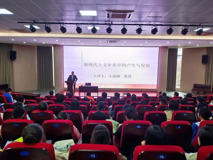 报告围绕“别现代主义(Biemodernism)的国际‘旅行’”“什么是别现代主义审美学”“别现代主义审美学范畴”和“别现代主义生命股权美感论”四个部分展开。王建疆首先从甲骨文“别”字引入,梳理了“别”字七种本义和引申义,同时他还结合中国古典哲学、美学和文论中的许多事例,阐释了中国古典文化中存在的“别”思维和“别”文化现象。其次,他就别现代理论创构的机缘及其在欧美学界和艺术界的交流和传播情况作了介绍。结合古今中外大量的文学艺术现象及生活现象,他重点就别现代主义审美学的“自调节审美”“内审美”“生命股权美感论”等美学范畴作了深入浅出地解读,图文并茂,语言生动,幽默风趣。特别是讲到生命股权美感论,他运用伊斯特林幸福悖论对美感和幸福感所展开批评分析,现场反响强烈,具有很强的现实感。