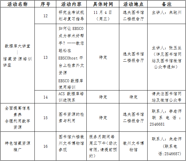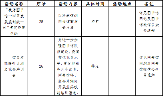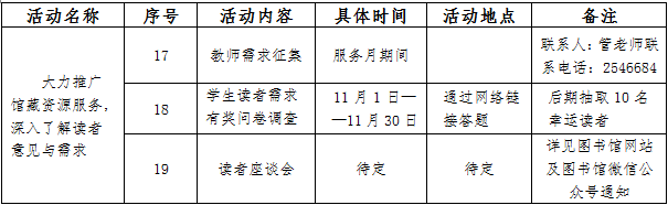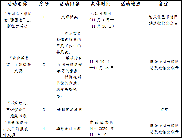 以上活动,请广大读者给予支持并积极参与,部分获得的具体安排将另行通知,敬请关注校园网、图书馆主页、图书馆微信公众号及图书馆内海报。