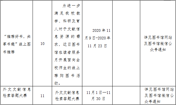 为充分发挥图书馆文献信息资源中心的作用,全方位多层次地推进校园文化建设,图书馆将举办第十二届读者服务宣传月系列活动,现将活动事项通知如下: