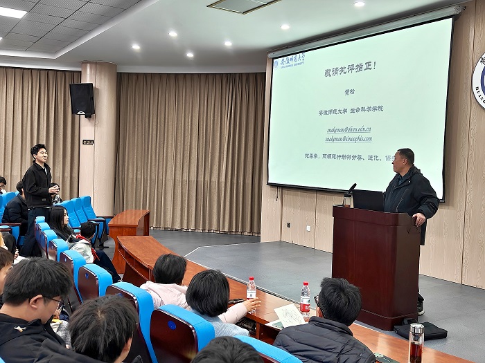 “做自己感兴趣的事,是人生中最大的幸事。”黄松教授鼓励学生们寻找自己感兴趣的生物类群。现场氛围热烈,同学表现出极大的兴趣,踊跃提问。会后,黄松教授与生物科学专业教师就专业建设、学科发展进行深入探讨。