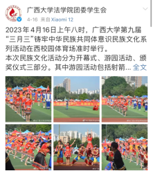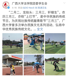 玩滚球官网制作民族团结主题学习资料并进行民族团结为主题的推文宣传,介绍了“三月三”民族节日和如何维护民族团结等相关知识,使全院师生进一步了解“马克思主义五观、四个认同、三个离不开”等民族政策,通过学习民族团结模范事迹汲取榜样力量,增强民族团结精神和爱国主义意识。